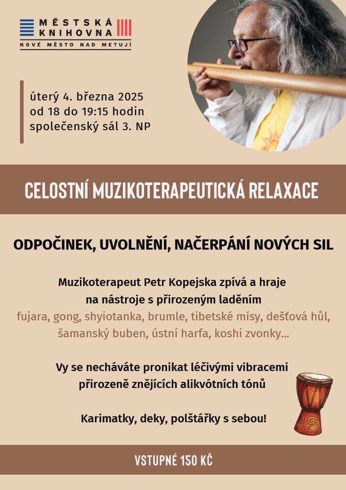 Muzikoterapeut Ing. Petr Kopejska nabízí odpočinek, relaxaci a načerpání nových sil. Za zvuků nástrojů s přirozeným laděním a zpěvu se můžete nechat pronikat léčivými vibracemi alikvótních tónů. Na relaxaci trvající asi hodinu a čtvrt je vhodné přinést si s sebou vlastní karimatky, deky a polštářky.