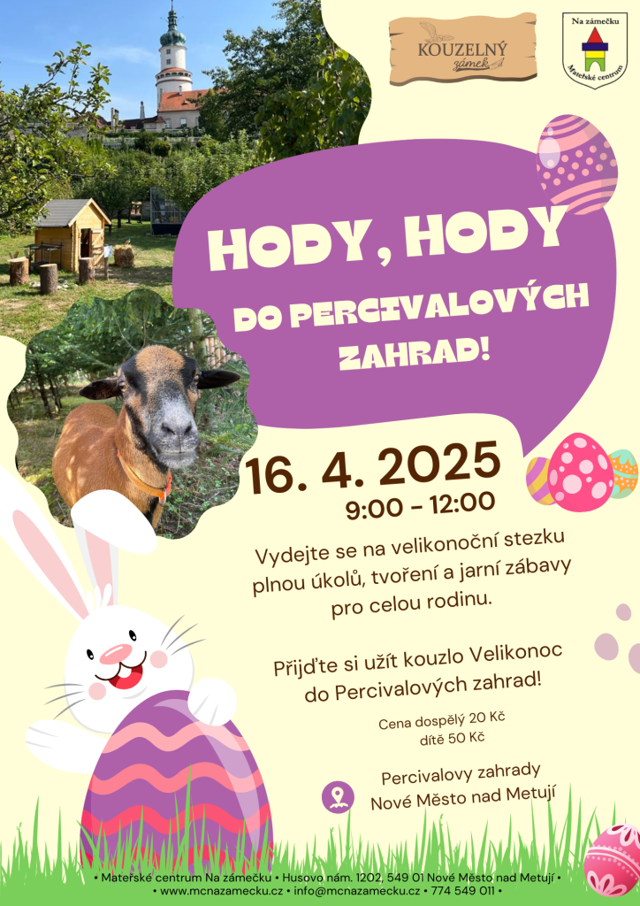 Mateřské centrum Na zámečku a Kouzelný zámek vás srdečně zvou na velikonoční stezku plnou úkolů, tvoření a jarní zábavy pro celou rodinu! Přijďte si užít jarní atmosféru, setkat se se zvířátky a prožít krásné dopoledne v Percivalových zahradách v Novém Městě nad Metují.