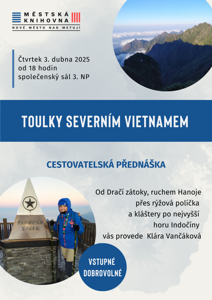 Zveme vás na cestovatelskou přednášku o Severním Vietnamu. Od Dračí zátoky, ruchem Hanoje přes rýžová políčka a kláštery po nejvyšší horu Indočíny vás provede Klára Vančáková.