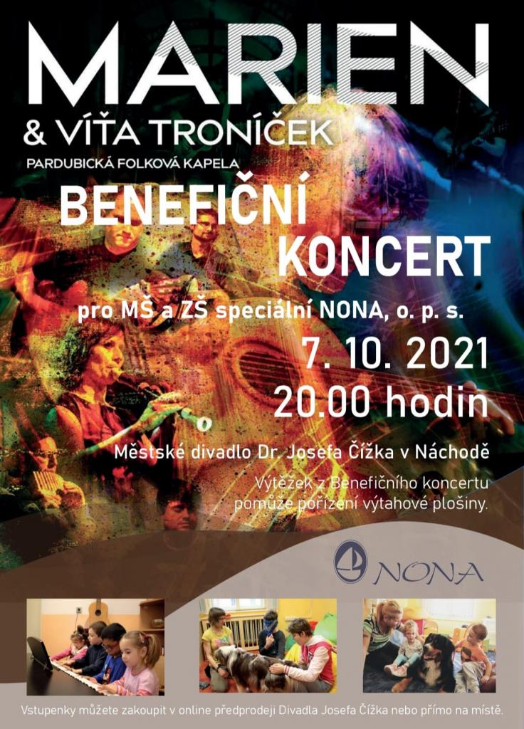 Pardubická folková kapela Marien se rozhodla svým benefičním koncertem v Městském divadle Dr. Josefa Čížka v Náchodě podpořit MŠ a ZŠ Nona Nové Město n/Met. Koncert se koná tento čtvrtek, 7. října 2021, od 20.00 hod a výtěžek z něj pomůže NONĚ pořídit výtahovou plošinu pro handicapované děti.