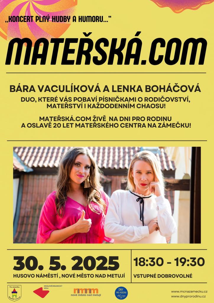 Na pódiu se objeví Mateřská.com – Bára Vaculíková a Lenka Boháčová, které vám ukážou, že rodičovství může být pěkná jízda… a skvělá zábava!