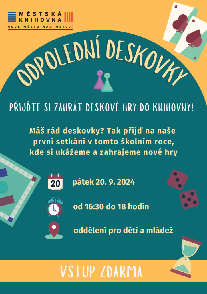 Na našem prvním setkání v tomto školním roce, si zahrajeme několik nově pořízených her. Můžete si přinést i vlastní hru, kterou byste si chtěli zahrát. Vstup zdarma