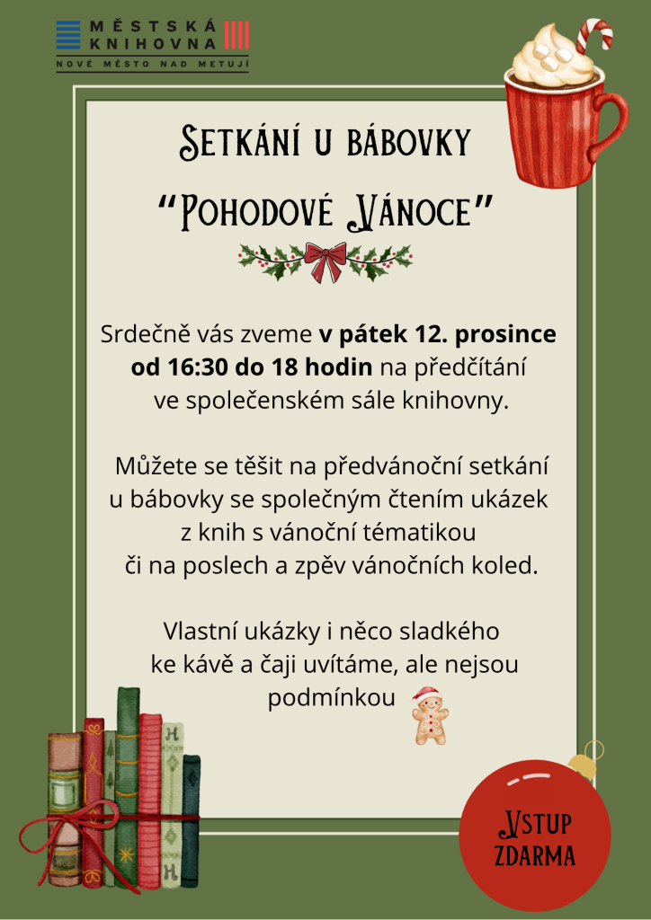 Můžete se těšit na předvánoční setkání u bábovky se společným čtením ukázek z knih s vánoční tématikou či na poslech a zpěv vánočních koled.