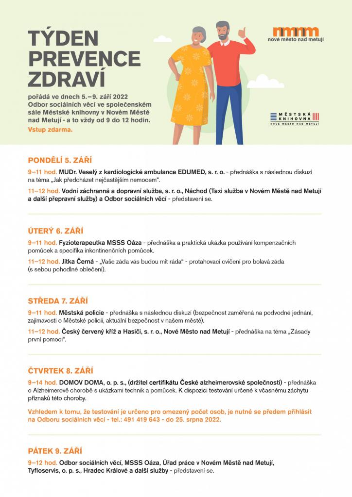 - 9–14 hod. DOMOV DOMA, o. p. s., (držitel certifikátu České alzheimerovské společnosti) - přednáška o Alzheimerově chorobě s ukázkami technik a pomůcek. K dispozici testování určené k včasnému záchytu příznaků této choroby. (Vzhledem k tomu, že testování je určeno pro omezený počet osob, je nutné se předem přihlásit na Odboru sociálních věcí - tel.: 491 419 643 - do 25. srpna 2022.)